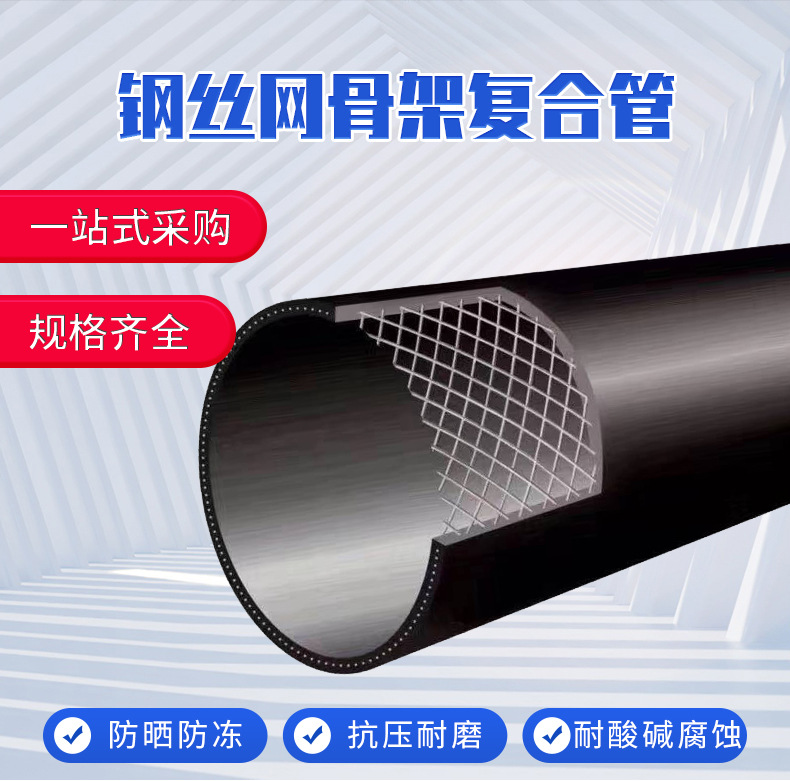 PE鋼絲網(wǎng)骨架塑料復合管是以高強度鋼絲和聚乙烯塑料為原材料,以纏繞成型的高繩度鋼絲為芯層,以高密度聚乙烯塑料為內、外層 ,形成整體管壁的一種新型復合結構管材。復合管加入鋼絲增強網(wǎng),不但在管材耐壓能力上比PE實壁管有了很大的提高,同時還保留了PE實壁管優(yōu)異的耐腐蝕性、無水垢等特點。其增強體被包覆在連續(xù)熱熔性塑料之中,保證了鋼絲與外界的隔離,使得鋼絲的使用壽命更長久,保證管材長久的耐幫性能。